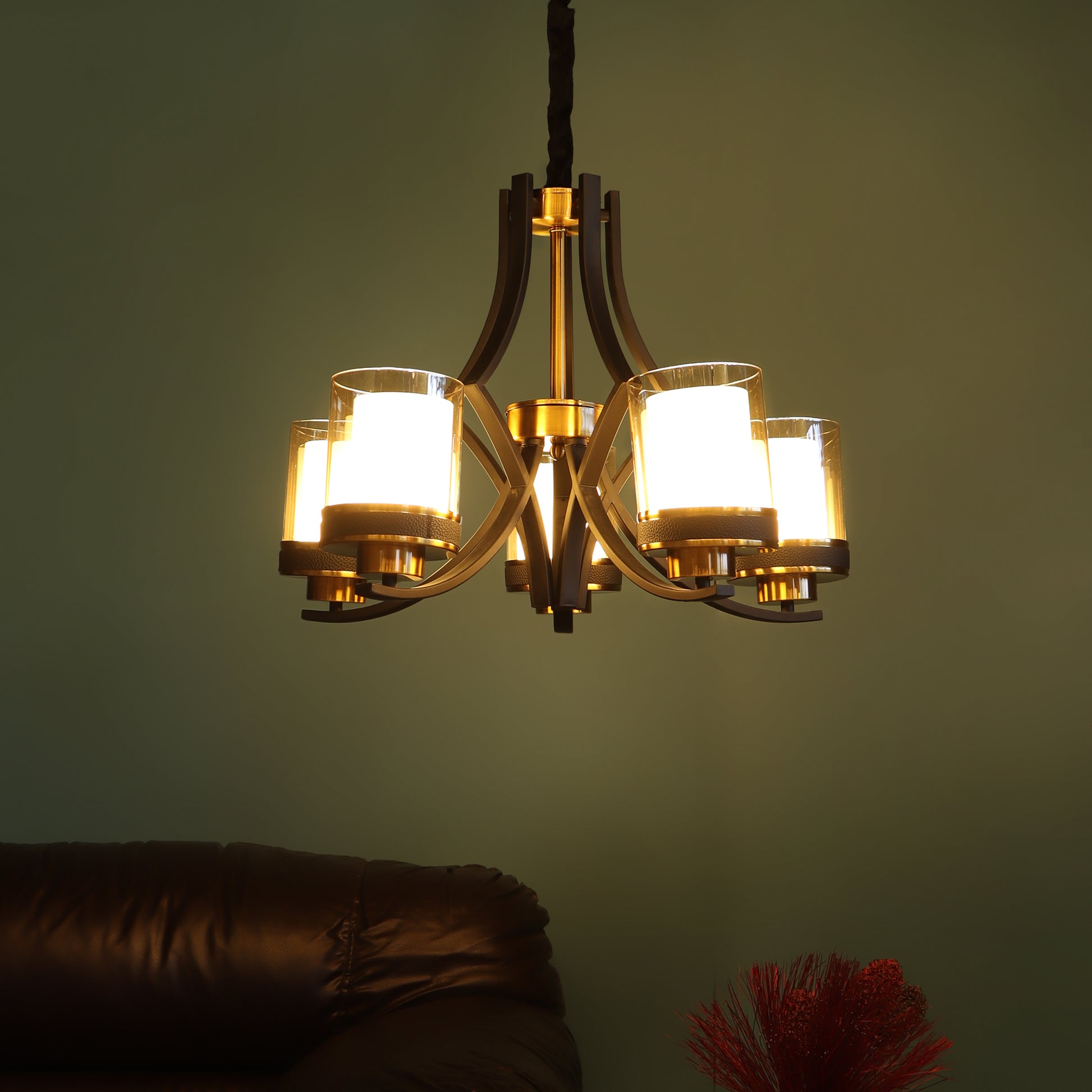 OCEAN MODERN CHANDELIER IN BLACK AND GOLD FINISH WITH DOUBLE GLASS SHADE.
