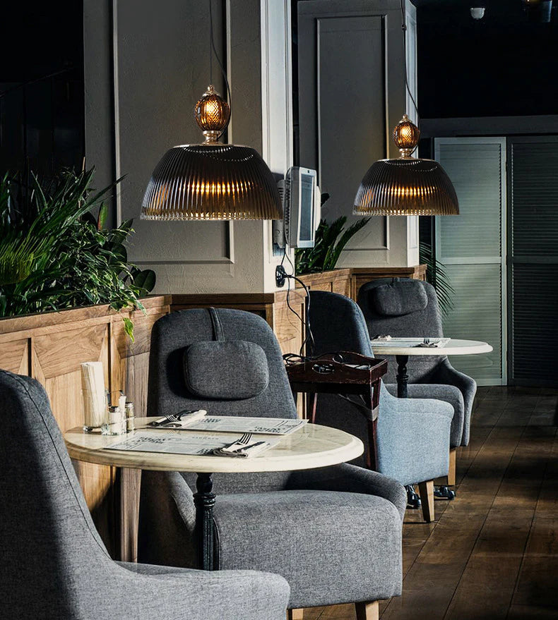 Elevate your interior décor with this elegant Vintage Ribbed Glass Pendant Light, blending timeless charm with modern aesthetics. The rich smoky black glass and gold detailing create a warm, luxurious atmosphere.